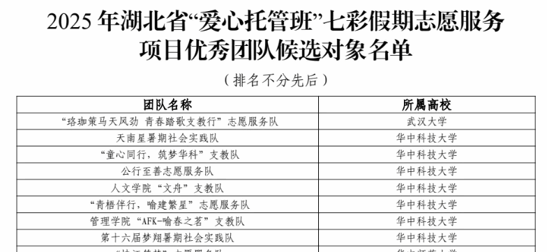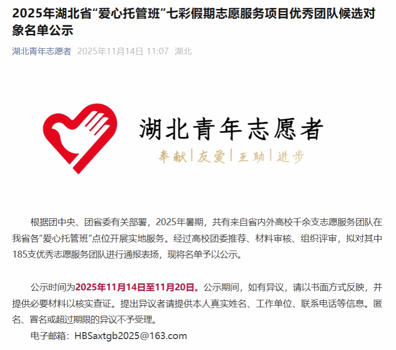 (通讯员 陈金林)近日,湖北省青年志愿者协会公布2025年湖北省“爱心托管班”七彩假期志愿服务项目优秀团队名单,英国威廉希尔唯一官网“砼心筑梦”志愿服务队凭借扎实的服务成效与突出的综合表现,成功获评“优秀团队”荣誉称号。